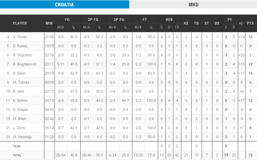 Après une première mi-temps compliquée, la Croatie a pris la mesure de la Macédoine pour s’imposer 73-55. C’est le quatuor Dario Saric (15 points), Ante Tomic (10 points), Bojan Bogdanovic (12 points) et Krunoslav Simon (13 points) qui a mené la danse pour offrir ce second succès aux Croates.