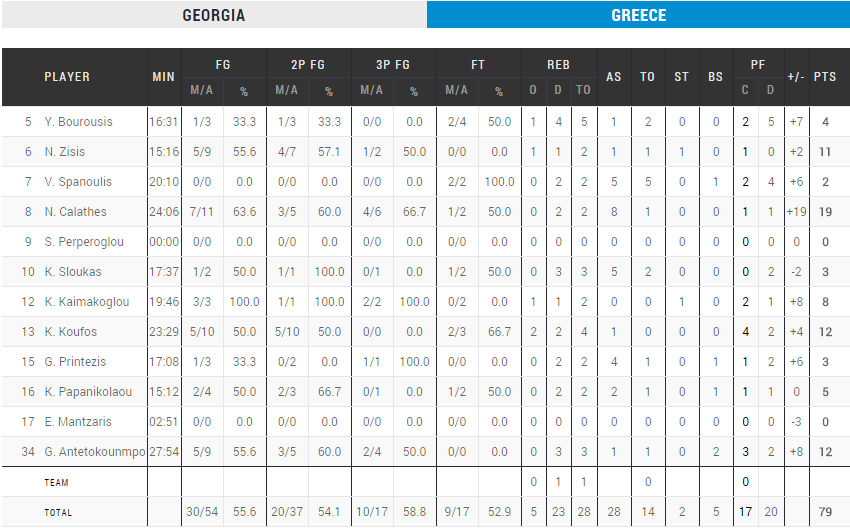 Aucun souci pour la Grèce, qui continue son parcours parfait en dominant la Géorgie 79-68. Ils se sont appuyés sur une énorme première mi-temps durant laquelle ils ont mis la Géorgie à 28 points et Fotis Katsikaris a pu faire tourner son effectif. Nick Calathes termine avec 19 points, Kosa Koufos et Giannis Antetokounmpo 12 chacun. La Géorgie est quasiment éliminée mais a encore une petite chance si elle gagne ses deux derniers matchs.