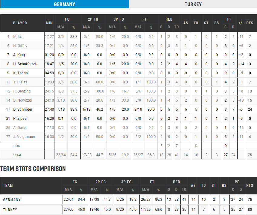 Avec deux tirs à trois points consécutifs signé Muhammed et Omsan, la Turquie a mis un coup aux espoirs allemands, qui accusaient encore 18 points de retard à 6 minutes du buzzer. On pensait le match plié mais les locaux n’ont pas baissé les bras et ils ont surtout enfin trouver la mire à trois points par Schaffartzik et Schröder pour lancer un 14-3 qui les a mis à seulement 6 points à 1’50 de la fin. Pleiss a même eu un ballon pour revenir à moins 4 mais il a échoué et la Turquie a géré tranquillement la dernière minute.