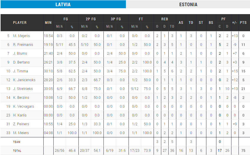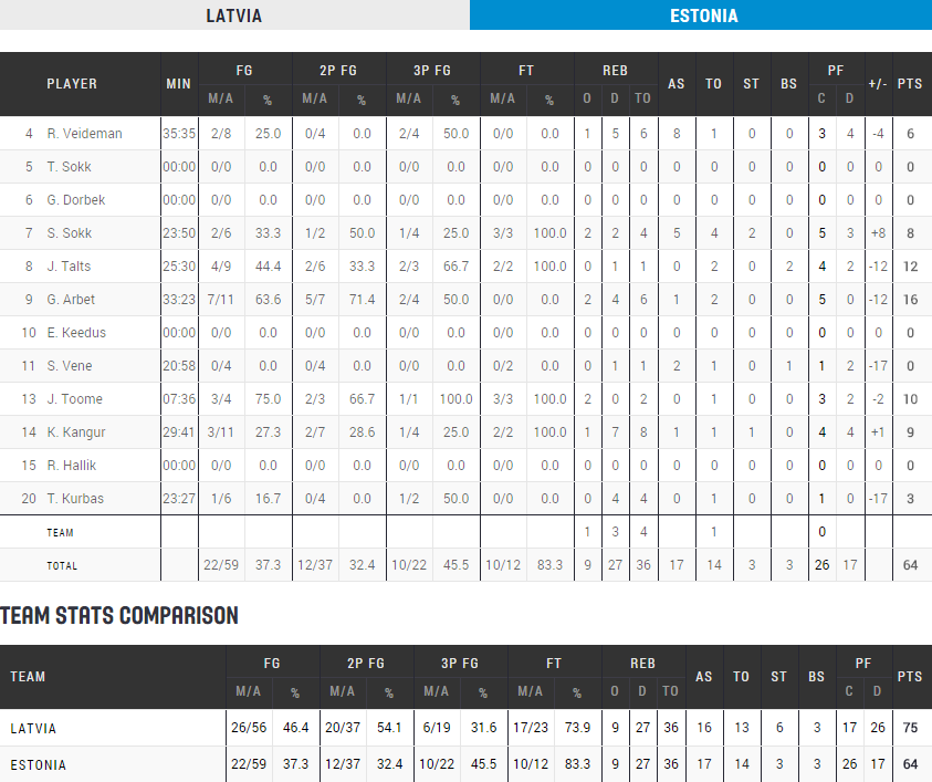 L’Estonie a entamé ce match décisif sur les chapeaux de roues avec un 11-0 en seulement 2’40. En grande réussite à l’extérieur ils ont porté leur avance à 14 points, 29-15 après 10 minutes grâce à 10 points de Joosep Toome. Les visiteurs ont continué sur leur lancée en second quart avec toujours cette adresse extérieure insolente et sur un trois points de Sten Sokk, le score est passé à 41-25. Poussée par son public la Lettonie a enfin réagi en terminant bien la première mi-temps sur un 8-3 pour revenir à 11 points (33-44).