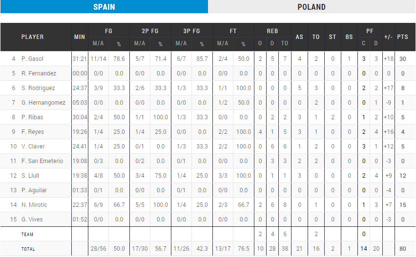 Mise en difficulté pendant 3 quarts temps l’Espagne a effectué un gros dernier quart, entamé par un 22-4, pour s’imposer 80-66. L’homme du match se nomme Pau Gasol, auteur d’un match énormissime avec 30 points à 11/14 dont un exceptionnel 6/7 à trois points, 7 rebonds et 4 passes ! L’expérience et la profondeur de banc ont fait la différence. Nikola Mirotic signe 15 points et Sergio Llull 12. Côté Polonais un seul joueur atteint les 10 points, Kulig.