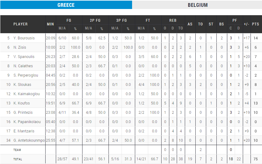 Accrochée une mi-temps, la Grèce a appuyé sur l’accélérateur après la pause, déposant totalement la Belgique pour s’imposer 75-54. Les Grecs n’ont même pas eu l’air de forcer pour se qualifier en quart où ils retrouveront le vainqueur d’Espagne – Pologne. Comme nous l’annoncions dans nos clés de cette rencontre, le secteur intérieur grec a marché sur celui Belge avec le duo Kosta Koufos (13 points, 9 rebonds en 20 minutes) – Ioannis Bourousis (14 points) . Printezis et Antetokounmpo ajoutent 10 points chacun. La Belgique aura donc tenu 20 minutes dans le sillage de San Van Rossum (13 points) et Matt Lojeski (10 points) mais elle a été à court de solutions des deux côtés du terrain après la pause. Les Belgian Lions n’ont inscrit que 16 points lors des 18 premières minutes de la seconde mi-temps.