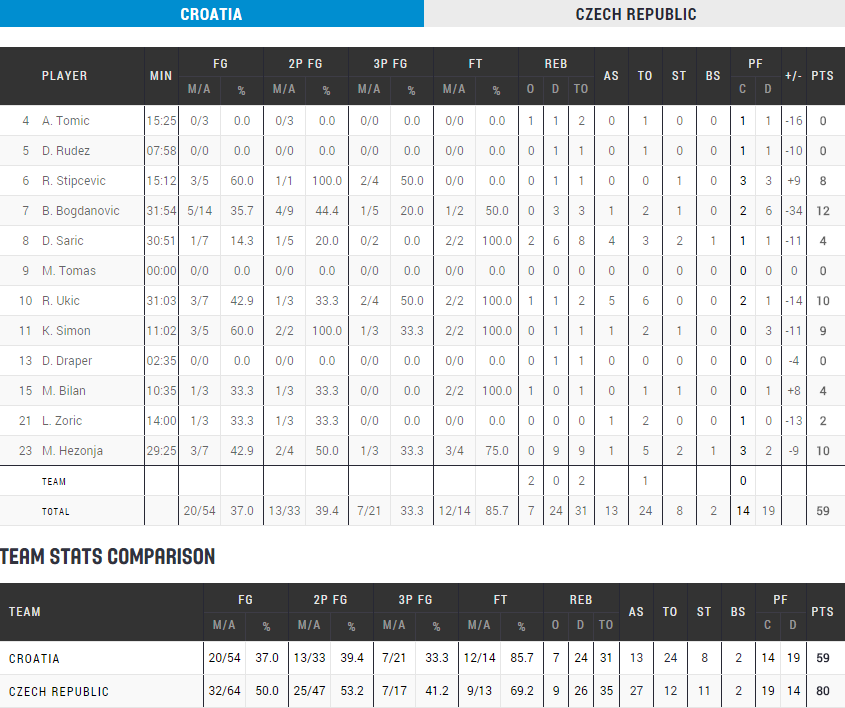 Pour ne rien arranger Simon s’est blessé en début de seconde mi-temps et la République tchèque a intercepté sur le premier ballon. Les Croates ont perdu le ballon sur quatre des six premières attaques et les Tchèques ont passé les 20 points d’avance 56-33 après 4 minutes. Alors que la première mi-temps n’avait pas été bonne pour les Croates, le début du second quart a été catastrophique puisqu’après 6 minutes le score du quart était de 11-2, sans le moindre panier croate. La disette s’est poursuivie et le score est passé à 63-33 avant de voir le premier panier signé Ukic à 1’30, soit plus de 10 minutes sans le moindre panier. La Croatie a bien fini pour réduire l’addition à 22 points sur un 8-2.