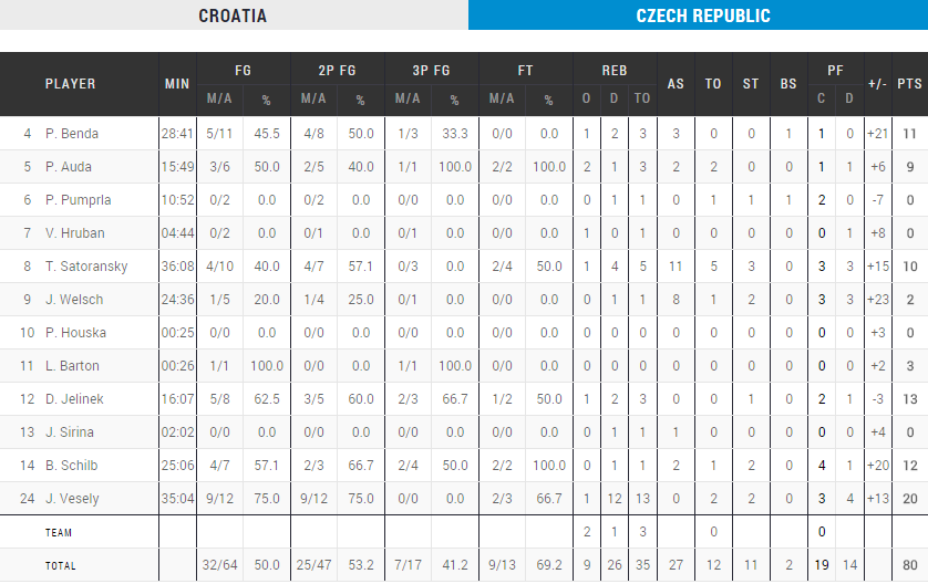 Les premières minutes ont été marquées par la maladresse des deux équipes (0/4 pour Bojan Bogdanovic) et après 5 minutes les deux équipes étaient à égalité 7-7. Dans le sillage de l’excellent trio Schilb – Vesely – Satoransky, la République tchèque a fait le premier mini-break du match sur un 11-0 pour mener 18-9 malgré un bon début de rencontre de Mario Hezonja, mais beaucoup trop de ballons perdus croates. Après 10 minutes c’est la République tchèque qui menait logiquement 20-13.