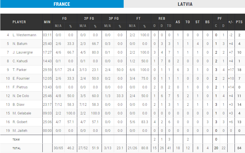 Boris Diaw termine avec 14 points, Rudy Gobert 13 et Nando De Colo 11. Tony Parker marque lui 18 points en plus de 6 passes, mais il a connu un match compliqué à l’adresse (5/17) à l’exception d’un énorme coup de chaud en fin de mi-temps.