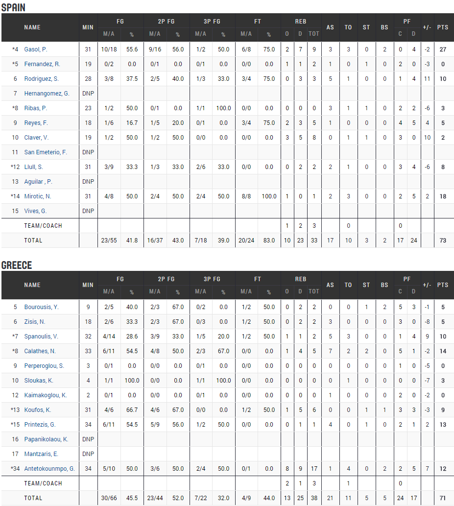 La Grèce a pris l’avantage pour la première fois du match sur un lancer franc de Kosta Koufos, consécutif à un tir à trois points de Giannis Antetokounmpo, ultra présent (7 points et 9 rebonds en 14 minutes). Toujours aussi maladroites, les deux équipes n’ont pas pu faire le moindre mini-break dans les 5 premières minutes, les deux défenses ayant l’avantage sur les attaques. C’est finalement Nikola Mirotic avec 5 points de suite qui a permis aux siens de prendre 7 points d’avance avec un seul panier marqué par les Grecs en 4’50. L’Espagne s’est petit à petit mise en place offensivement pour aligner les paniers face à une défense grecque bien plus en difficulté. Les joueurs de Sergio Scariolo ont inscrit des points sur 6 possessions de suite alors que Yorgos Printezis a été le seul à limiter la casse, 33-25. Le duo Sergio Rodriguez – Pau Gasol a été intenable en fin de quart et après 20 minutes l’Espagne menait logiquement 39-32 avec 15 points en moins de 5 minutes pour finir la mi-temps. A la pause le duo Gasol – Mirotic comptait 26 points.