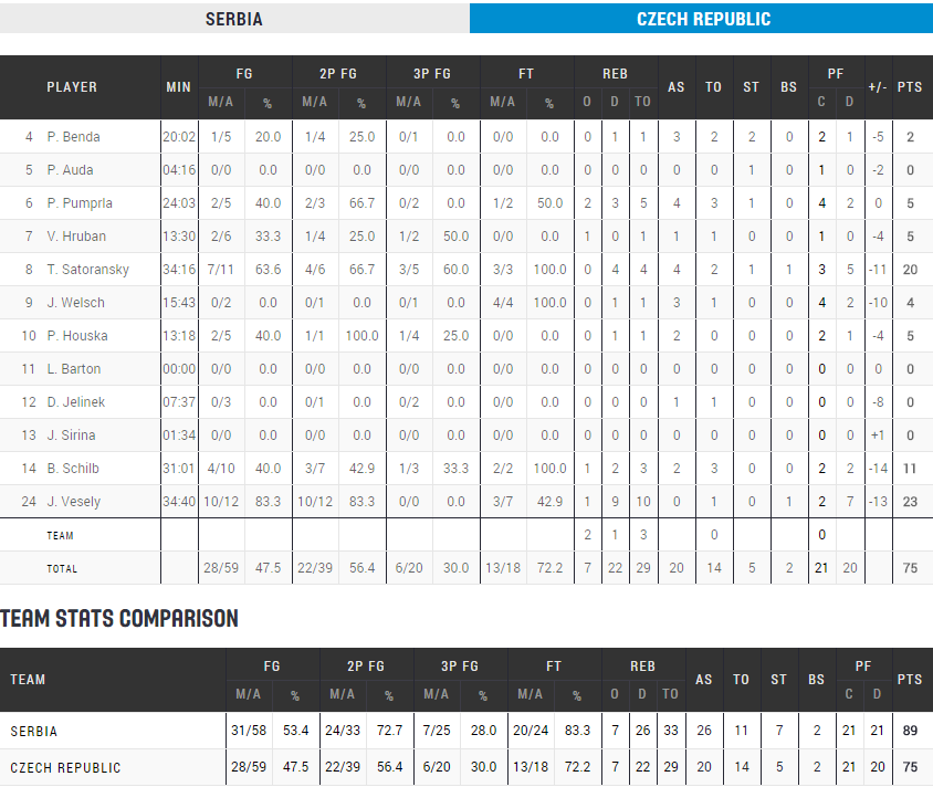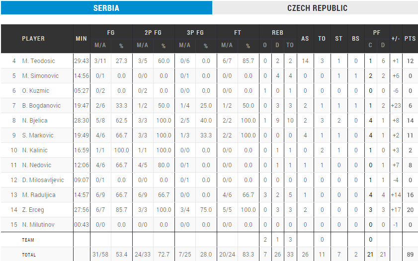 Les Serbes ont rapidement mis fin un coup sur la tête des tchèques en débutant par un 8-1 sous l’impulsion de Teodosic et Raduljica pour mener 75-64. Excellent Satoransky et Vesely ont toutefois maintenu un écart autour de 7-10 mais la corde a fini par lâcher sur un 10-2 avec des tirs à trois points de Bjelica et Bogdanovic.