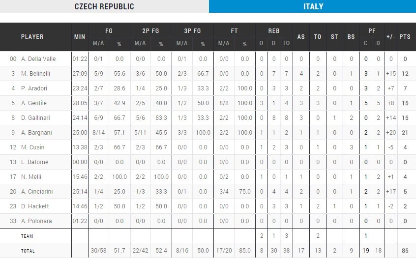 Lors des 10 premières minutes on a eu droit à un chassé croisé assez plaisant avec pas moins de 11 changements de leader et pas plus de 4 points d’écart. Jan Vesely a été très en vue avec 11 des 21 points de son équipe mais après 10 minutes de jeu les deux équipes étaient à égalité.En second acte les deux équipes ont continué de se répondre coup pour coup sans qu’aucune ne réussisse à faire le moindre break. Il a fallu attendre 5 points de suite de Pietro Aradori pour voir un mini-break de 5 points en faveur de la Squadra à 3 minutes de la pause. Si Houska a permis de réduire l’écart derrière l’arc, les deux derniers paniers de la mi-temps ont été Italiens par Belinelli et Gallinari qui ont donné une petite avance de 5 points aux leurs, 42-37.