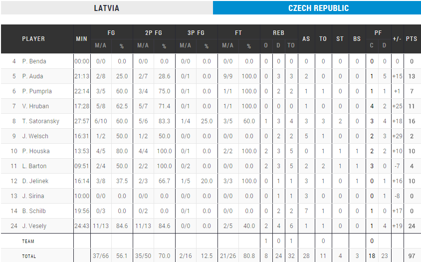 On connait le nom de la dernière équipe européenne qualifiée pour le tournoi qualificatif olympique qui aura lieu l’été prochain. La République tchèque a battu aisément la Lettonie 97-70. La différence s’est faite lors du second et troisième quarts, à sens unique, et l’écart est monté jusqu’à 36 points. Jan Vesely signe 24 points à 11/13 et Tomas Satoransky 16 points. 7 tchèques marquent au moins 10 points.