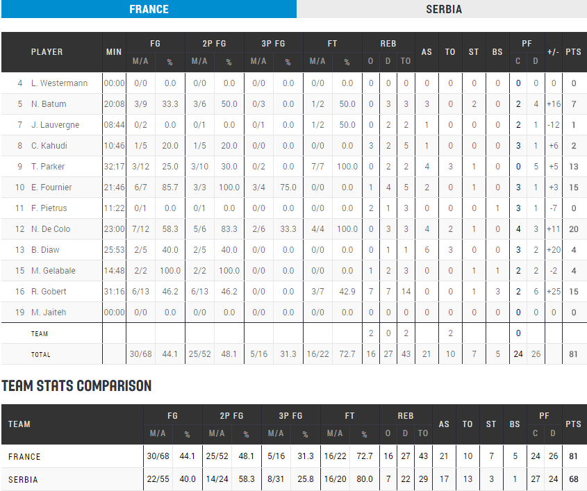 Raduljica a inscrit 5 points de suite en début de dernier quart face à Lauvergne, dominé, pour rapprocher les siens à 9 points à 7’30 du terme. Les bleus ont connu quelques minutes compliquées en attaque mais leur défense leur a permis de conserver 9 points d’avance à 5 minutes du terme. Puis 5 points de suite d’Evan Fournier ont fait énormément de bien pour mener de 13 points à 4 minutes de la fin. Rudy Gobert a ensuite pris le relais pour contenir la tentative de run serbe et Boris Diaw a mis le coup final à trois points, 76-63 à 1’20 du buzzer.