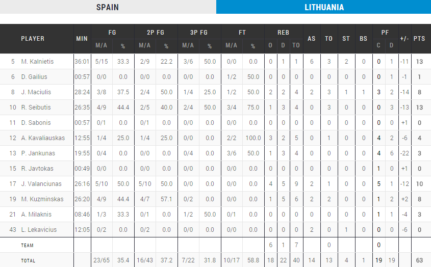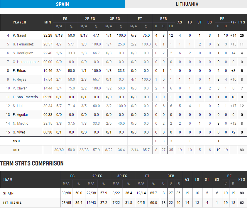 L’Espagne a calmé d’entrée les ardeurs lituaniennes en débutant par un 11-2 dans un copier-coller du début du match. La Lituanie a connu le plus grand mal en attaque alors que l’Espagne déroulait offensivement, 52-35. La Lituanie a fait quelques bonnes séquences défensives, mais n’a pas pu faire mieux qu’un 4-0, Pau Gasol mettant le coup d’accélérateur nécessaire pour garder une avance d’une quinzaine de points. Un panier derrière l’arc de Victor Claver leur a même donnés 18 points d’avance pour au final un score de 60-43 après 30 minutes.