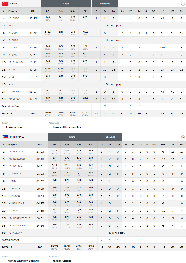 La Chine a validé son billet pour les Jeux Olympiques de Rio en remportant le championnat d’Asie. Les coéquipiers de Jianlian Yi ont dominé la compétition de bout en bout (aucune défaite) et décroché le titre en finale en battant les Philippines d’Andray Blatche 79-67 en ayant dominé tout le match. Si Yi n’a pas réalisé son meilleur match avec 11 points à 4/14 et 15 rebonds, Qi Zhou (14 points et 14 rebonds) et Ailun Guo (19 points) ont fait le job. Côté philippin Blatche termine avec 17 points à 6/13 et 5 rebonds.