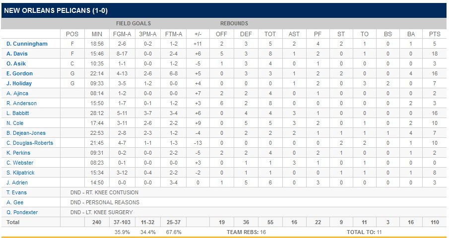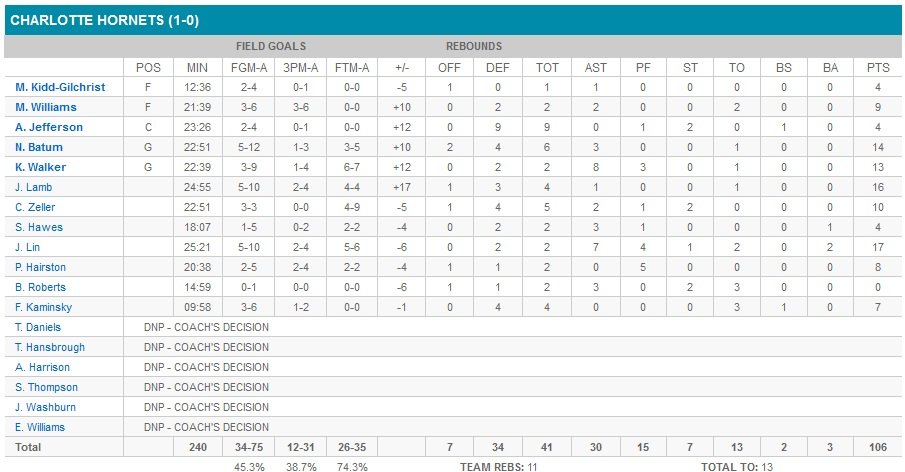 Pour ses débuts sous le maillot des Hornets, Nicolas Batum a joué 22 minutes pour 14 points à 5/12, 6 rebonds et 3 passes. Jeremy Lin signe lui 17 points, Jeremy Lamb 16 alors qu’en face Andrew Nicholson termine meilleur marqueur de la rencontre avec 23 points et 8 rebonds en 21 minutes. Lui aussi faisait ses débuts avec le Magic, Mario Hezonja, 5e choix de la draft, termine à 9 points. Le rookie des Hornets Frank Kaminsky marque 7 points et 4 rebonds.