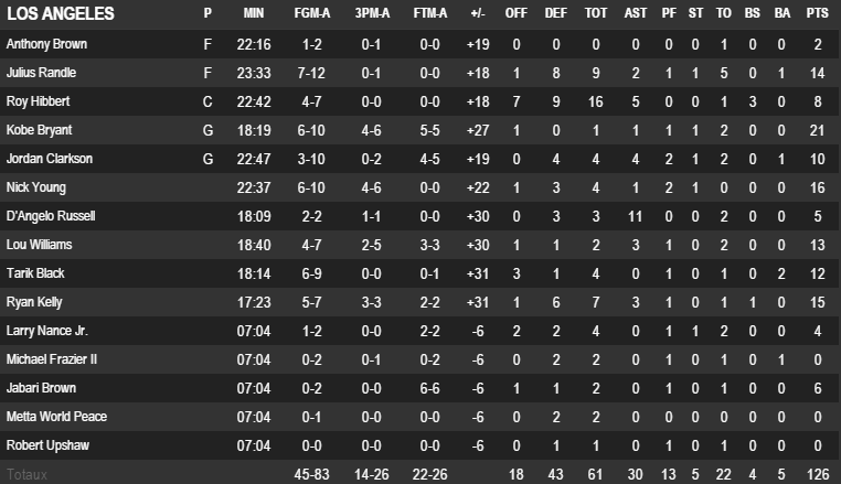 Les deux Global Games de la nuit ont tourné court avec des démonstrations des Wizards et des Lakers. Kobe Bryant en a profité pour marquer 21 points en seulement 18 minutes. D’Angelo Russell était de retour et il signe 5 points et 11 passes en 18 minutes.