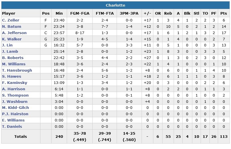 Nicolas Batum a livré une excellente feuille de stats malgré un petit pourcentage (3/8) avec 14 points à 7/7 aux lancers-francs, 10 rebonds et 5 passes en 23 minutes. Cinq autres de ses coéquipiers dépassent ou atteignent la barre des 10 points avec notamment 17 points à 8/17, 6 rebonds et 2 contres de la part d’Al Jefferson.