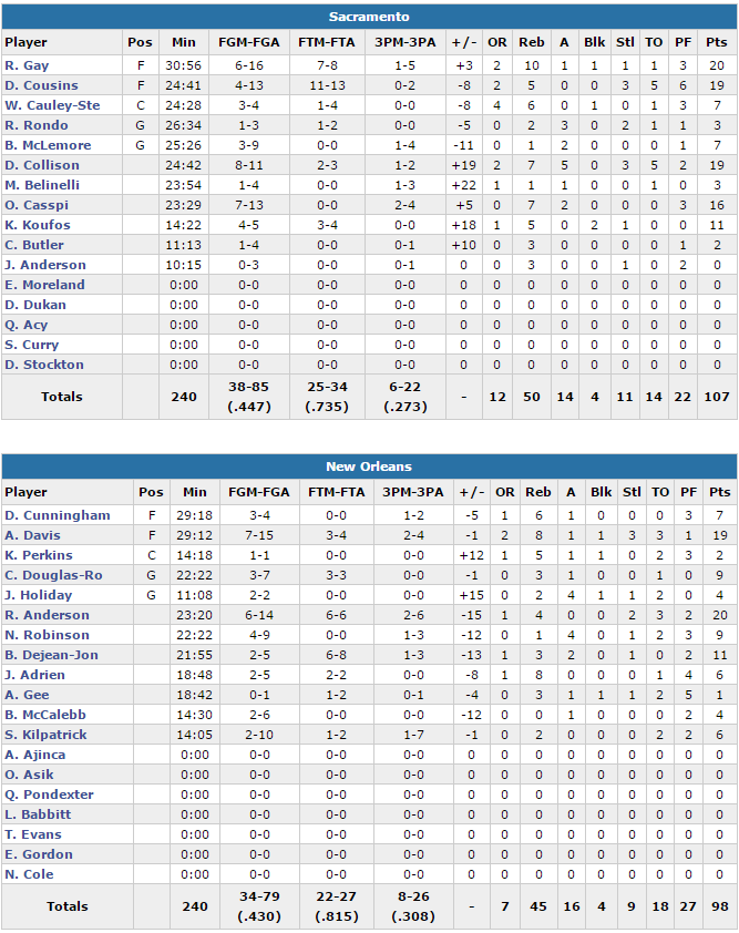 Dans le sillage du trio Rudy Gay (20 points), DeMarcus Cousins (19 points) et Darren Collison (19 points), les Kings s’imposent encore cette fois face aux Pelicans d’Anthony Davis (19 points).