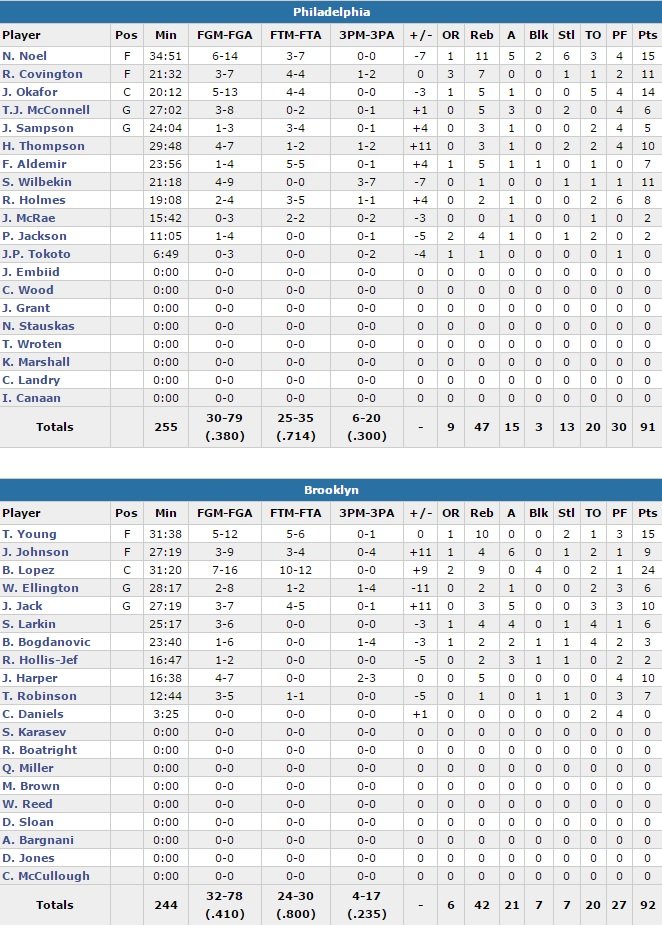 Brook Lopez compile 24 points à 7/16, 9 rebonds et 4 contres et Thaddeus Young 15 points et 10 rebonds. Les Nets ont shooté à 41% contre seulement 38% aux Sixers, menés eux par Nerlens Noel (15 points, 11 rebonds, 6 interceptions, 5 passes, 2 contres) et Jahlil Okafor (14 points, 5 rebonds et 5 ballons perdus).