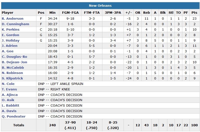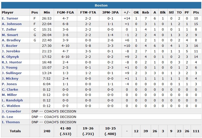 Porté par les 16 points de Terry Rozier (+ 6 passes et 4 rebonds mais 4/10 aux tirs), les Celtics se sont imposés face aux Nets de Bojan Bogdanovic (18 points) alors que Houston a mis 20 points à des Pelicans qui jouaient sans Anthony Davis (repos) mais qui ont tout de même pu compter sur 23 points et 11 rebonds de Ryan Anderson. James Harden joue 29 minutes et artille avec un 6/19 pour 20 points, 4 rebonds et 4 passes.