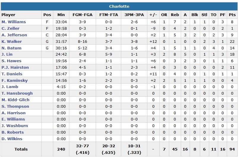 Les Hornets eux n’ont toujours pas perdu le moindre match et cette nuit ce sont les Bulls qui en ont fait les frais. Le duo Kemba Walker (22 points à 8/16) – Jeremy Lin (18 points à 6/8, 8 rebonds et 5 passes) fonctionne à merveille. Nicolas Batum signe lui 14 points à 5/12, 5 rebonds 1 passe et 1 contre en 30 minutes. En face Joakim Noah ne passe pas loin du triple-double avec 12 points 13 rebonds et 7 passes pour épauler Jimmy Butler (18 points) mais les Bulls coulent à 3-points avec un tout petit 6/27 de loin.