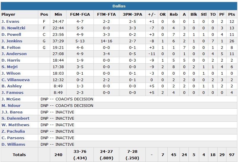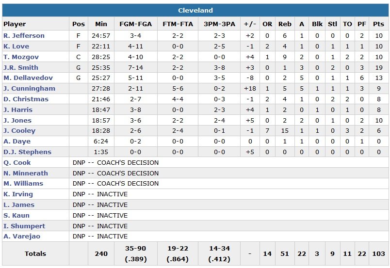 Cleveland a obtenu une première victoire en 7 matchs dans cette pré-saison en battant Dallas. Pas de LeBron James dans la rotation (repos) mais un J.R. Smith plutôt efficace qui termine meilleur marqueur de son équipe (mais pas du match puisque John Jenkins inscrit 26 pts dont 16 lancers-francs pour les Mavs) avec 19 points à 7/14, 3 passes et 2 interceptions en 25 minutes. L’intégralité du cinq majeur des Cavs inscrit au moins 10 points et l’équipe a shooté à 14/34 de loin contre 7/28 pour les Mavericks.