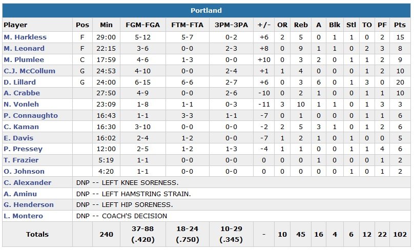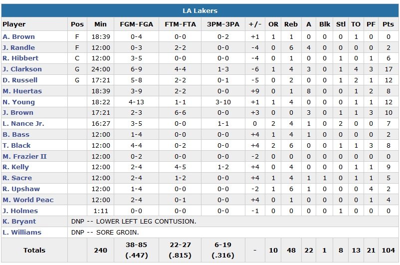 Enfin les Lakers ont été clutchs avec pour commencer un dunk de la gagne de Ryan Kelly à 2 secondes du buzzer final ! D’Angelo Russell plante lui 8 de ses 23 points dans les 3 dernières minutes et demi et Jordan Clarkson est le meilleur marqueur pour Los Angeles avec 17 points. Portland (revenu d’un déficit de 5 points à 15 secondes du terme), mené par les 20 points à 6/15, 3 rebonds et 6 passes de Damian Lillard, s’incline donc de deux points au Staples Center.
