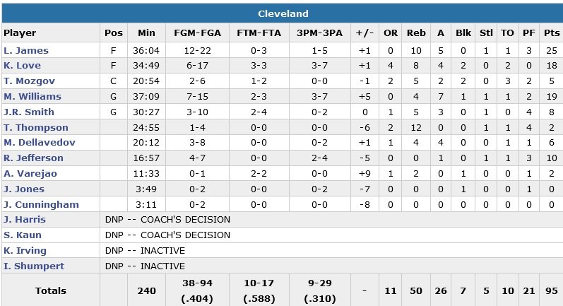 Chicago n’a pas vraiment pris feu dans ce nouveau système plus ouvert proposé par Fred Hoiberg mais la victoire reste prometteuse pour la suite. Remplaçant de Kyrie Irving, Mo Williams a répondu présent avec 19 pts et 7 passes alors que Kevin Love signe 18 pts et 8 rebonds. Cleveland prend un premier éclat (26-17) sur les 12 premières minutes mais reste à distance raisonnable à la mi-temps : 46-40 Chicago.