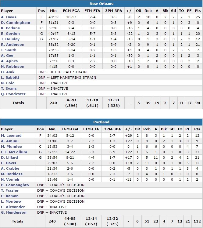 Cj McCollum a été intenable avec 37 points à 14/22 dont 6/9 à trois points alors que Damian Lillard ajoute 21 points et 11 passes. Limités à 39.1% (50% pour Portland), les Pelicans n’ont pas existé avec une nouvelle fois un Anthony Davis bien tenu, même s’il termine tout de même avec 25 points et 10 rebonds. Ryan Anderson et Eric Gordon ajoutent eux respectivement 21 et 20 points.