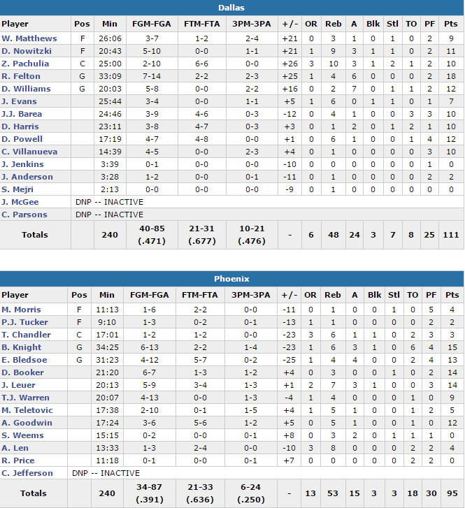 Les Mavs ont fait plier les Suns à coup de séries après 20 premières minutes accrochées ou les deux équipes ont pris tour à tour la tête. Dallas a conclu la première mi-temps par un 13-4 avant de débuter la seconde par un 12-4 pour se retrouver devant 66-49.