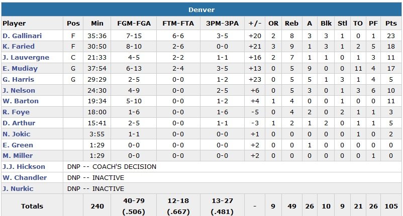 Cette toute nouvelle équipe de Denver s’est tranquillement imposée de 20 points cette nuit face aux Rockets, 105-85. Danilo Gallinari a mené ses troupes avec 23 points à 7/15, 8 rebonds, 3 passes et 3 contres mais la performance était avant tout collective à l’image des 18 points et 9 rebonds de Kenneth Faried, 17 points et 9 passes d’Emmanuel Mudiay (qui commet aussi 11 pertes de balles) et 11 points et 7 rebonds de Joffrey Lauvergne.