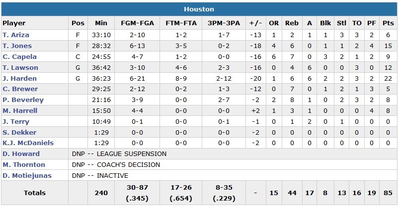 À noter : Houston jouait sans Dwight Howard (match de suspension). Clint Capela, titularisé pour la première fois de sa jeune carrière, a signé 9 points et 7 rebonds en son absence.