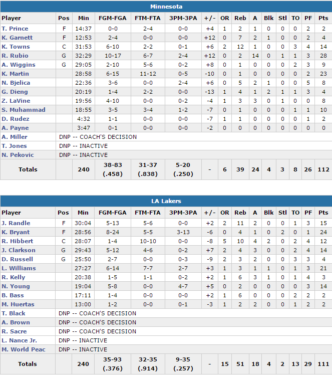 Dans le sillage de Lou Williams (21 points) et d’un excellent Kobe Bryant en première mi-temps (15 de ses 24 points à 8/24), qui dépassait le record de John Stockton pour le plus grand nombre de saisons avec la même équipe, les Lakers se sont installés aux commandes du match après 12 minutes, 31-22. Ils ont continué de faire la course en tête avec un score de 60-51 à la pause et ont même augmenté leur avance au retour des vestiaires avec notamment Julius Randle (15 points et 11 rebonds) pour se retrouver bien installés 73-68 puis 85-70 à 4 minutes de la fin du troisième. C’est à ce moment-là que le match a tourné puisque les Wolves ont terminé le quart sur un 18-10 sous l’impulsion de Kevin Martin et Shabazzz Muhammad (10 points). Revenus à 7 points en début de dernier acte les Wolves ont passé un 11-2 aux Lakers pour prendre les commandes 99-97 et même s’envoler grâce à Rubio et Towns, 111-102 à 2’11 du terme. LA a alors passé un 9-1 dont un 3 points de Lou Williams qui a réduit le score à 112-111 mais le floater de l’ancien Raptor à la dernière seconde a rebondi sur le cercle.