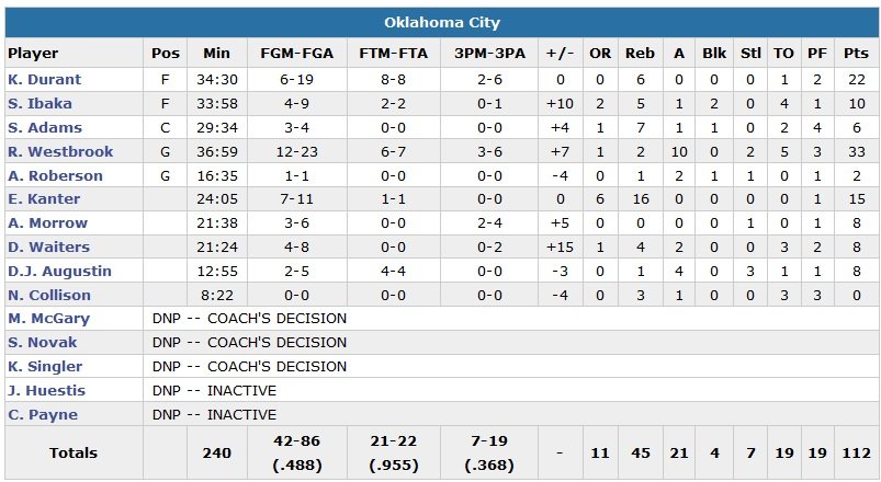 Russell Westbrook claque 33 points à 12/23 et 10 passes alors que son compère Kevin Durant, qui jouait là son premier match de saison régulière depuis le mois de février dernier, termine à 22 points à 6/19 et 6 rebonds mais surtout 2 lancers-francs cruciaux à 11.5 secondes du terme. Enes Kanter suit avec 15 points et 16 rebonds en sortie de banc. Kawhi Leonard pour les Spurs n’était pas en reste avec un record en carrière de 32 points (13/22, 8 rebonds) qui n’aura pas suffi à San Antonio. LaMarcus Aldridge termine à 11 points (4/12) et 5 rebonds pour son premier match officiel en tant que Spur après 9 ans à Portland. Manu Ginobili et Tony Parker suivent avec respectivement 11 et 10 points.