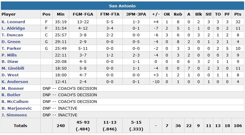 Russell Westbrook claque 33 points à 12/23 et 10 passes alors que son compère Kevin Durant, qui jouait là son premier match de saison régulière depuis le mois de février dernier, termine à 22 points à 6/19 et 6 rebonds mais surtout 2 lancers-francs cruciaux à 11.5 secondes du terme. Enes Kanter suit avec 15 points et 16 rebonds en sortie de banc. Kawhi Leonard pour les Spurs n’était pas en reste avec un record en carrière de 32 points (13/22, 8 rebonds) qui n’aura pas suffi à San Antonio. LaMarcus Aldridge termine à 11 points (4/12) et 5 rebonds pour son premier match officiel en tant que Spur après 9 ans à Portland. Manu Ginobili et Tony Parker suivent avec respectivement 11 et 10 points.