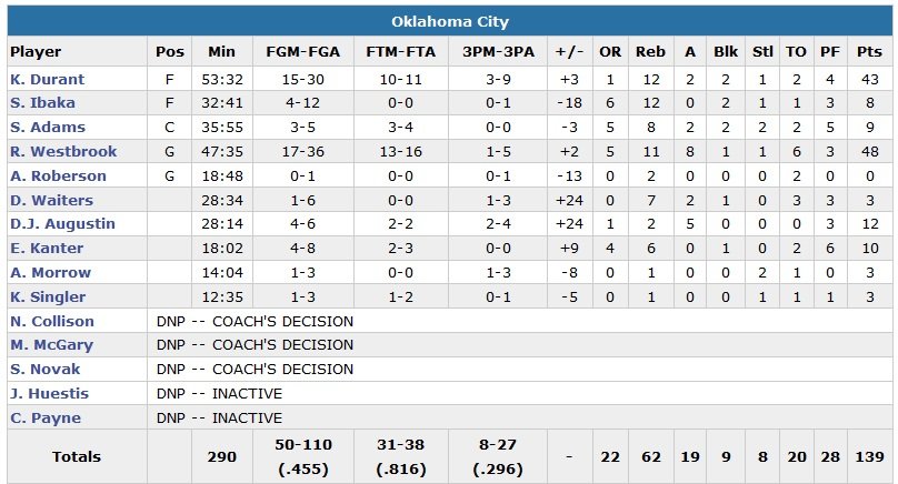 Match dingue à Orlando cette nuit ! Oklahoma City a eu très chaud mais s’en est sorti de justesse 139-136 après deux prolongations et grâce à deux énormes matchs de Russell Westbrook (48 points à 17/36, 11 rebonds et 8 passes) et Kevin Durant (43 points à 15/30 et 12 rebonds).