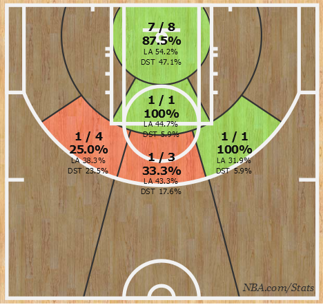 En deux petits matchs cette saison, Griffin (25/37 aux tirs soit 67.6% de réussite) ne s’économise pas et insiste à l’intérieur, comme en témoigne son shot chart contre les Mavericks jeudi (26 points à 11/17 et 10 rebonds).