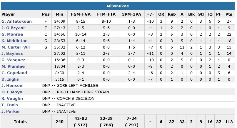 Les Wizards se sont remis d’un déficit de 13 points pour battre Milwaukee 118-113 grâce notamment à 26 pts (9/16) dont 14 dans le dernier quart-temps de la part de Bradley Beal. De retour après un match de suspension, Giannis Antetokounmpo a lui inscrits 23 de ses 27 pts en première mi-temps.