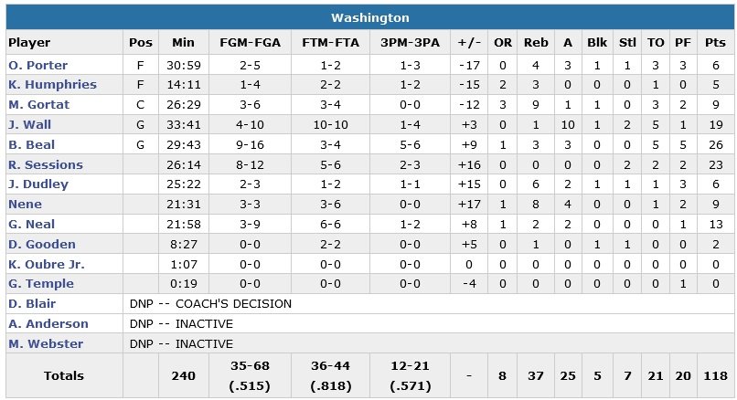 Washington score ainsi 11 points consécutifs pour passer devant d’un point 95-94 et pour la première fois du match depuis le premier panier de la rencontre signé Marcin Gortat (9 points, 9 rebonds). Beal va rentrer deux 3-points et Sessions un autre pour poursuivre sur un 9-2 (111-104) à 2 minutes du terme. Middleton répond par un 3+1 qui ramène Milwaukee à 116-113 à 12 secondes mais Gary Neal ne tremble pas sur la ligne des lancers-francs et sécurise la victoire des Wizards à 10 secondes du buzzer final.