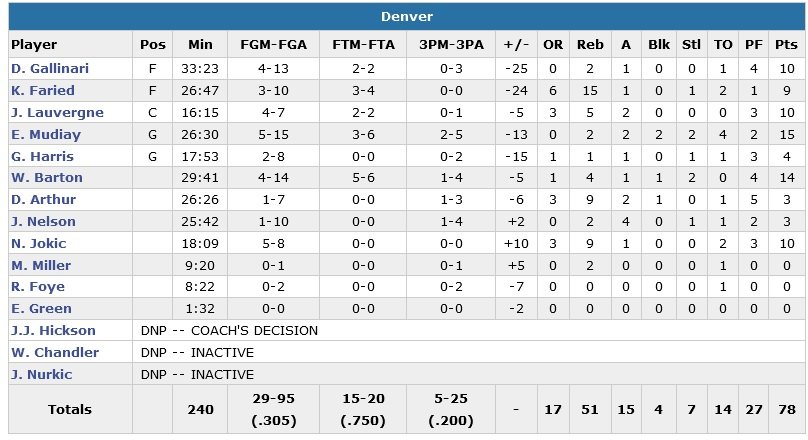 Pour son premier match devant le public de Denver, Emmanuel Mudiay, meilleur marqueur de Nuggets en grande difficulté aux tirs (30.5% et 5/25 à 3-points) inscrit 15 points à 5/15. Towns a posé des problèmes de matchup toute la soirée à Denver après une première soirée déjà réussie face aux Lakers pour ses débuts en NBA (14 points et 12 rebonds).