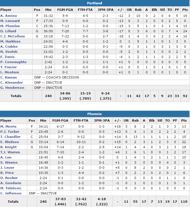 Le début de match a été un chassé-croisé pendant 8 minutes avant que les Suns ne terminent bien le quart, en passant un 7-0 pour virer devant 27-23. Les deux équipes ont continué d’être au coude à coude et sur un lancer de Warren à 6’20 de la pause, les locaux ont pris la tête pour de bon 38-37. Si les Suns sont restés devant, Portland était à seulement 1 point à une minute de la pause mais les hommes de Jeff Hornacek ont inscrit 5 lancers pour rentrer aux vestiaires sur le score de 55-49.