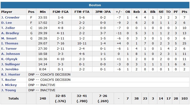 Le petit nouveau DeMarre Carroll s’acclimate bien à l’équipe avec 21 points dont 10 dans le troisième quart-temps alors que le Kyle Lowry new look distribue 9 passes tout en inscrivant 14 points. Comme souvent, le meilleur marqueur des Celtics se nomme Isaiah Thomas, 25 points. Avery Bradley ajoute 13 points dont un 3-points pour revenir à 108-99 à 1’54 mais qui n’empêchera pas Boston de s’incliner.