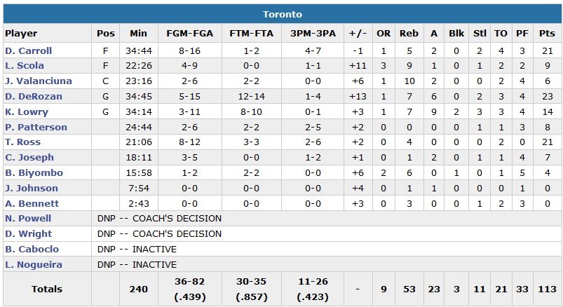 À noter : Toronto n’a rentré que 13 paniers en première mi-temps, dont 7 à 3-points. Les Raptors ont largement dominé le rebond (53-38).