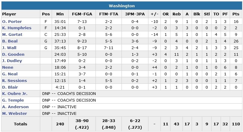 Face à Anthony, qui a manqué ses deux premiers shoots avant d’en enchaîner 8 d’affilée (dont 4 trois-points), Otto Porter Jr (16 points à 7/13 et 9 rebonds) a passé une soirée frustrante. Et longue. Le match a en effet duré 2h38. Washington (42.2% aux tirs et 6/22 à 3-points contre 47.7% et 9/19 pour New York) a collectivement manqué d’engagement en défense dans ce match physique : 62 fautes et 3 fautes techniques sifflées. Devant de trois points à la pause (59-56), c’est dans le quatrième et dernier quart-temps que les Knicks, qui n’ont jamais pris plus de 9 points d’avance durant la rencontre, vont faire la différence en passant un 30-20 à leurs adversaires.
