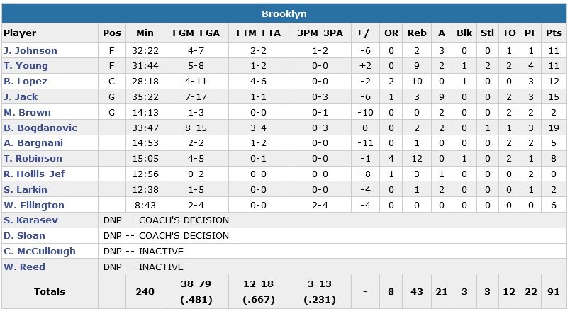 En face le meilleur marqueur se nomme Bojan Bogdanovic (19 points), épaulé par 15 points de Jarrett Jack et un petit double-double de Brook Lopez (12 points et 10 rebonds). Joe Johnson et Thaddeus Young ajoutent chacun 11 points. Les bancs des deux équipes se révèlent efficaces en première mi-temps avec 11 points de Bogdanovic et 8 points et 10 rebonds de Thomas Robinson pour Brooklyn et 10 points signés Green pour Memphis.