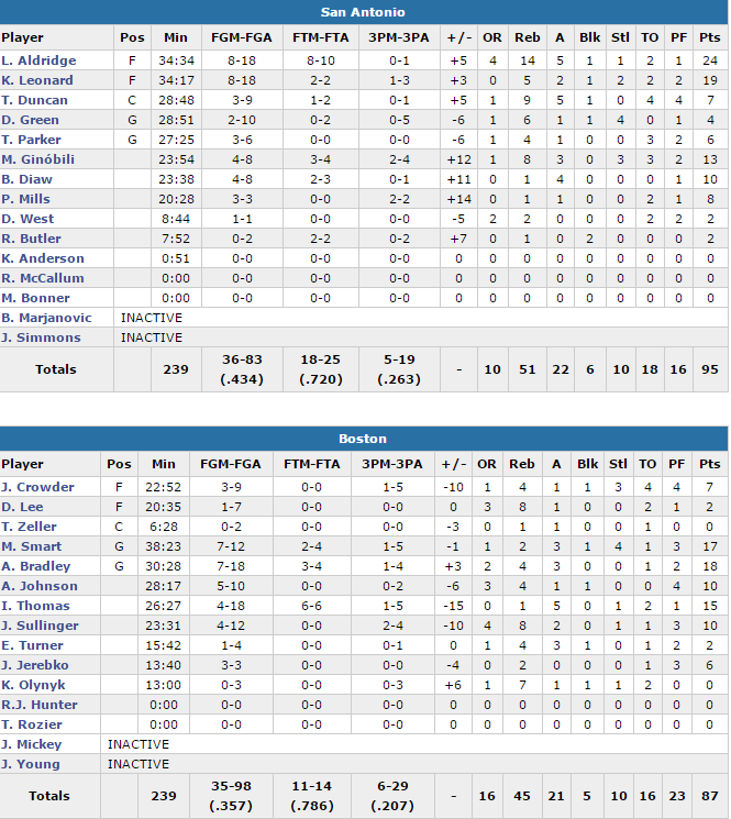 Les Celtics ont payé leur très mauvaise adresse, 35.7% dont un 6/29 à trois points. Le trio Boris Diaw (10 points et 4 passes), Manu Ginobili (13 points) et Patty Mills (8 points) a aussi eu un rôle important. Tony Parker termine lui avec 6 points et 4 passes. En face les Celtics ont été menés par les arrières Marcus Smart (17 points), Avery Bradley (18 points) et Isaiah Thomas (15 points). Jared Sullinger a lui participé au retour en fin de rencontre avec 10 points.