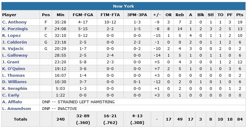 À noter : Kevin Seraphin a effectué ses débuts officiels sous ses nouvelles couleurs. Il n’a joué que 5 minutes pour 2 points à 1/3 et 2 rebonds. Kristaps Porzingis a dû quitter le terrain après un choc avec Carmelo Anthony à 2’49 de la fin du match. Le Letton semblait souffrir de la tête.