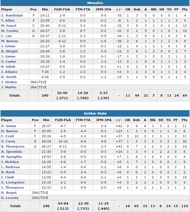 Stephen Curry termine avec 30 points en 28 minutes à 10/16 dont 4/8 à trois points et les 13 joueurs des Warriors marquent au moins 2 points. Ian Clark signe 15 points, Klay Thompson 14 et Draymond Green 11 points, 9 rebonds et 8 passes. Les Warriors ont shooté à 51.2% dont un 11/25 aux lancers et laissé seulement 11 rebonds offensifs aux Grizzlies pour un total de 65 rebonds.