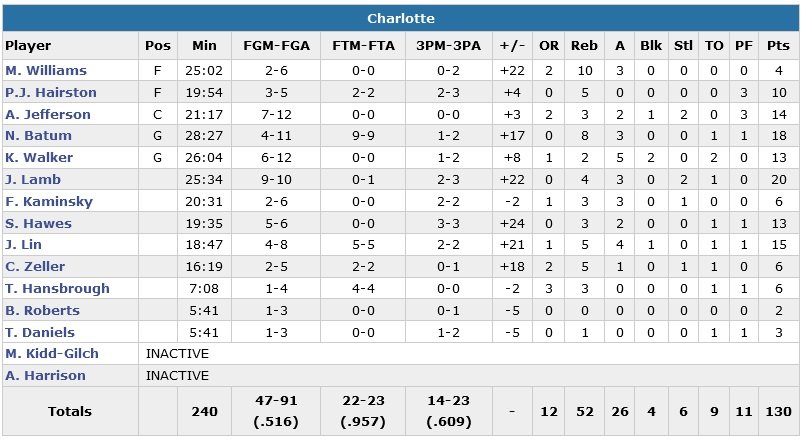 À noter : Cody Zeller a eu besoin de 8 points de suture sur le front après avoir reçu le coude de Joakim Noah sur un rebond. Il est ensuite revenu en jeu. Kemba Walker est pour sa part devenu le 4e (ex-æquo) shooteur à 3-points le plus prolifique de l’histoire des Hornets