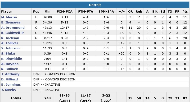 Parfaits jusque-là, les Pistons (3V-1D) ont pourtant été portés par un Andre Drummond (25 points à 12/17 et un record en carrière de 29 rebonds !) historique qui est devenu le premier Piston depuis au moins 1985 à enchaîner deux matchs à 20 points et 20 rebonds minimum ! Reggie Jackson y va lui de ses 20 points (8/20, 6 passes) alors que Marcus Morris a connu une soirée difficile aux tirs (3/11, 11 points et 7 rebonds).