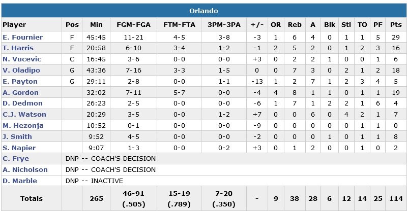 À noter : Dwight Howard a pris une faute flagrante pour avoir balancé Aaron Gordon à terre dans le deuxième quart-temps. Patrick Beverley, malade, a lui quitté le match à la mi-temps. Marcus Thornton poursuit son bon début de saison avec 18 points à 8/14 cette nuit.