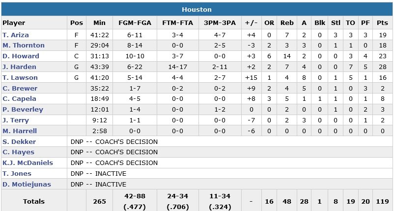 À noter : Dwight Howard a pris une faute flagrante pour avoir balancé Aaron Gordon à terre dans le deuxième quart-temps. Patrick Beverley, malade, a lui quitté le match à la mi-temps. Marcus Thornton poursuit son bon début de saison avec 18 points à 8/14 cette nuit.